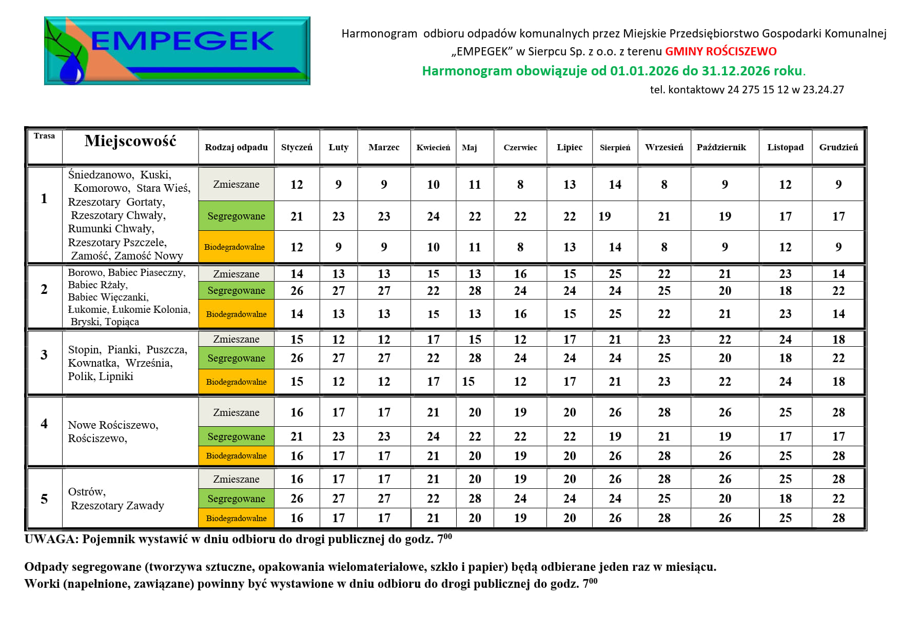 Harmonogram odbioru odpadów komunalnych – obowiązuje od 01.01.2026 r. do 31.12.2026 r.